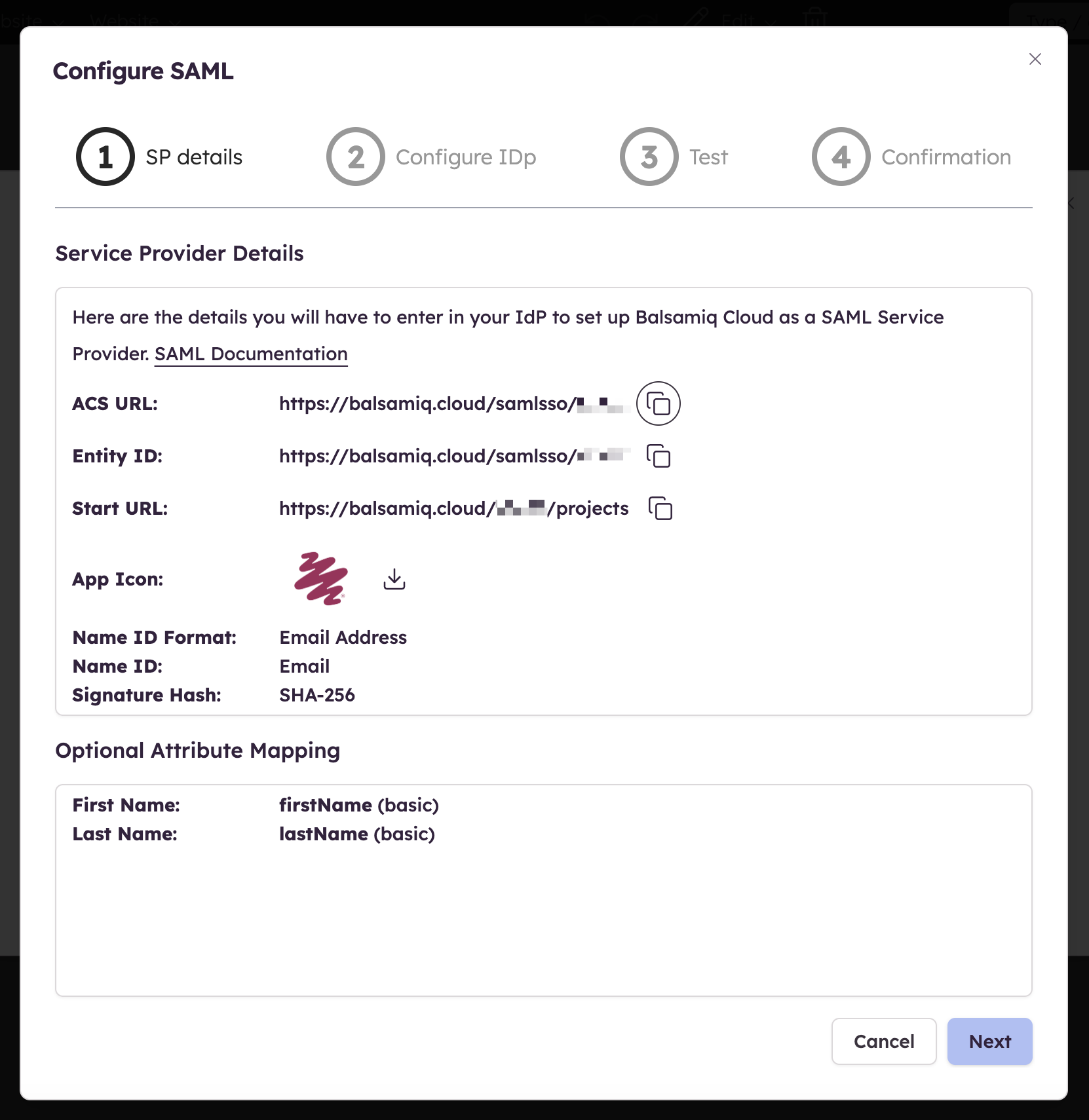 The first step of the configuration provides the details you need to enter in your Identity Provider to set up Balsamiq Cloud as a SAML Service Provider. Some terminologies might differ from one IdP to another so we'll cover some of those differences in this section.